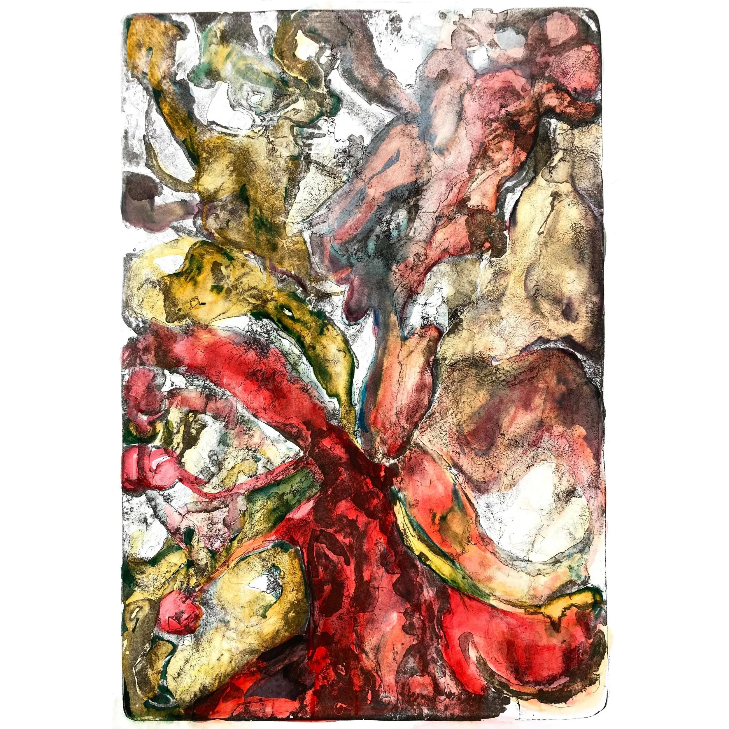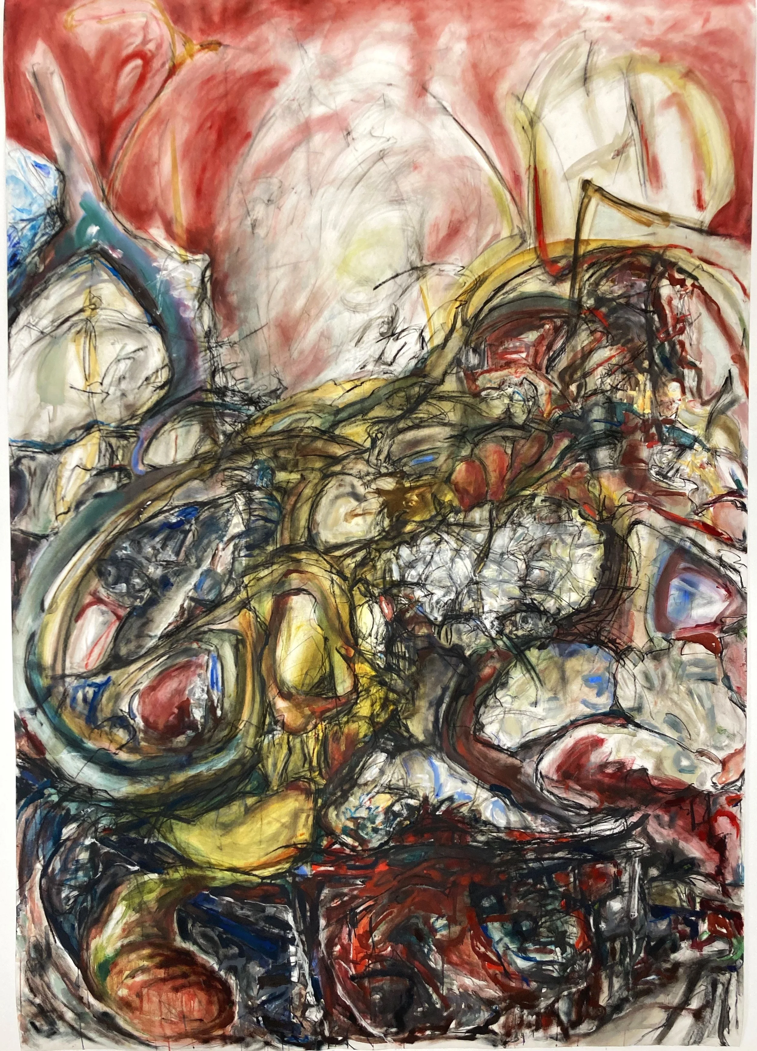 “In Painting and Printmaking, students have been grappling with current global issues, subverted fantasy stories and archetypal cultural tropes. Eerily yet undeniably relevant, Liz McNeill's paintings portray abstracted compositions of congestion, dissipation, and fragmented figurative elements that emerge from layers of oil, acrylic and gouache, implying something brutal and bodily. While encouraging viewers to derive their own interpretations and meanings from her works, she also addresses a central concept of moral injury, rooted in her own experiences as a cardiologist during the pandemic and AIDS crisis. This perspective informs her search for release in the present, as she addresses suffering in Gaza and considers more broadly where organisations intended to provide care often lack the necessary support from the very structures in which they operate.”